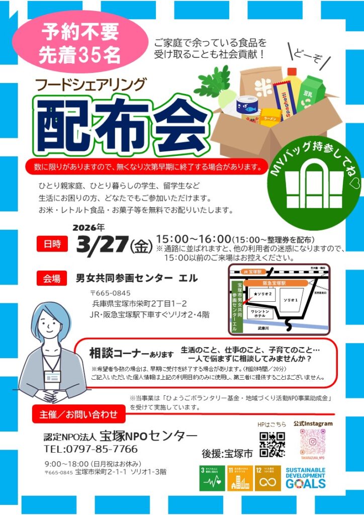 食品を集めて、配布する、宝塚NPOセンターのフードシェアリングがまた始まりました。